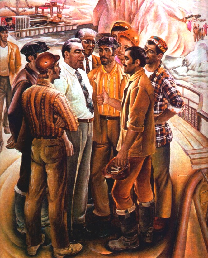 Г. Яралова, М. Абдурахманов. Л.И. Брежнев у строителей Нурекской ГЭС.