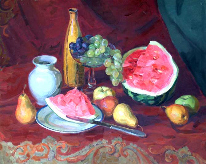 Н. Калмыков. Натюрморт с виноградом и арбузом. 1969